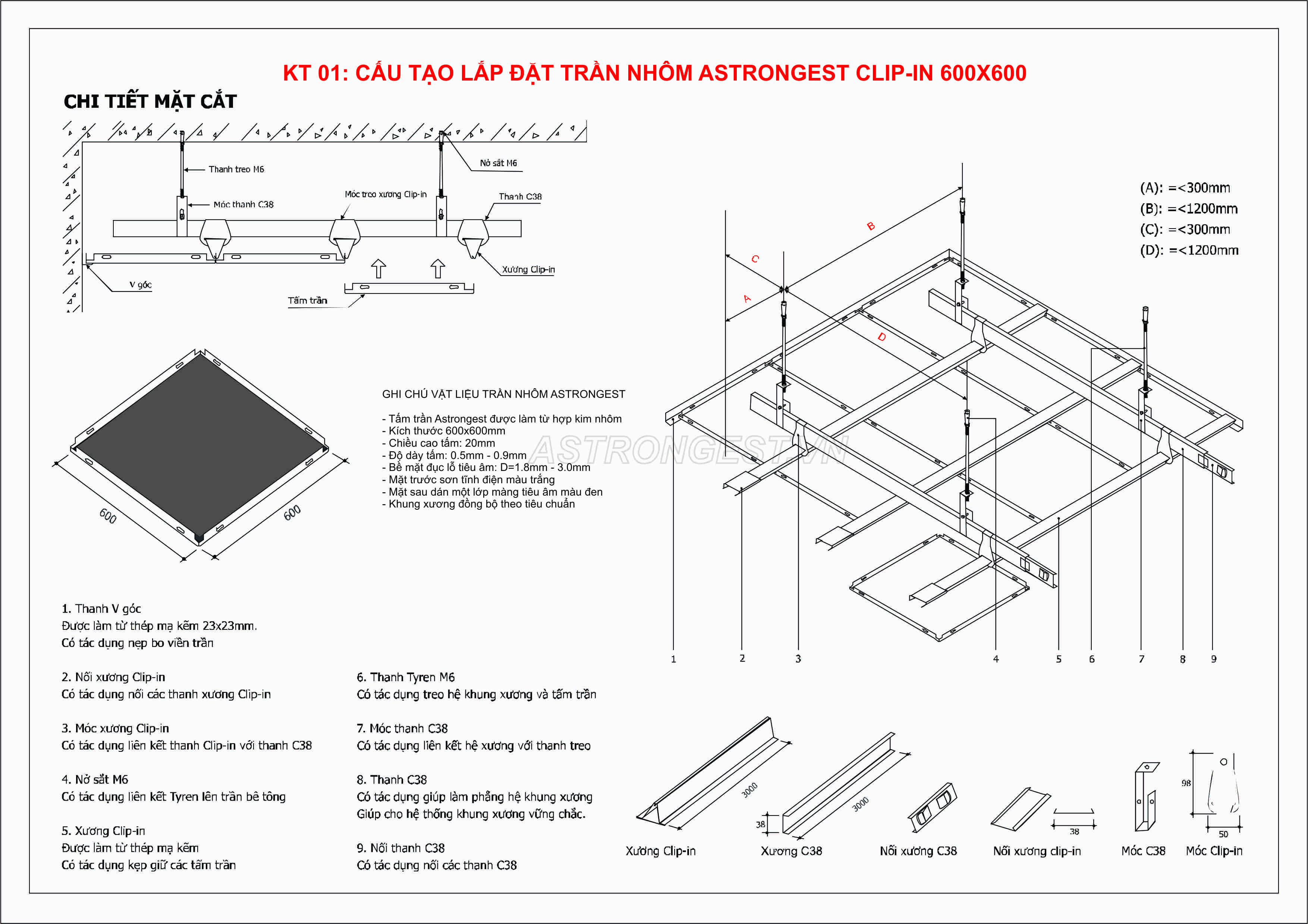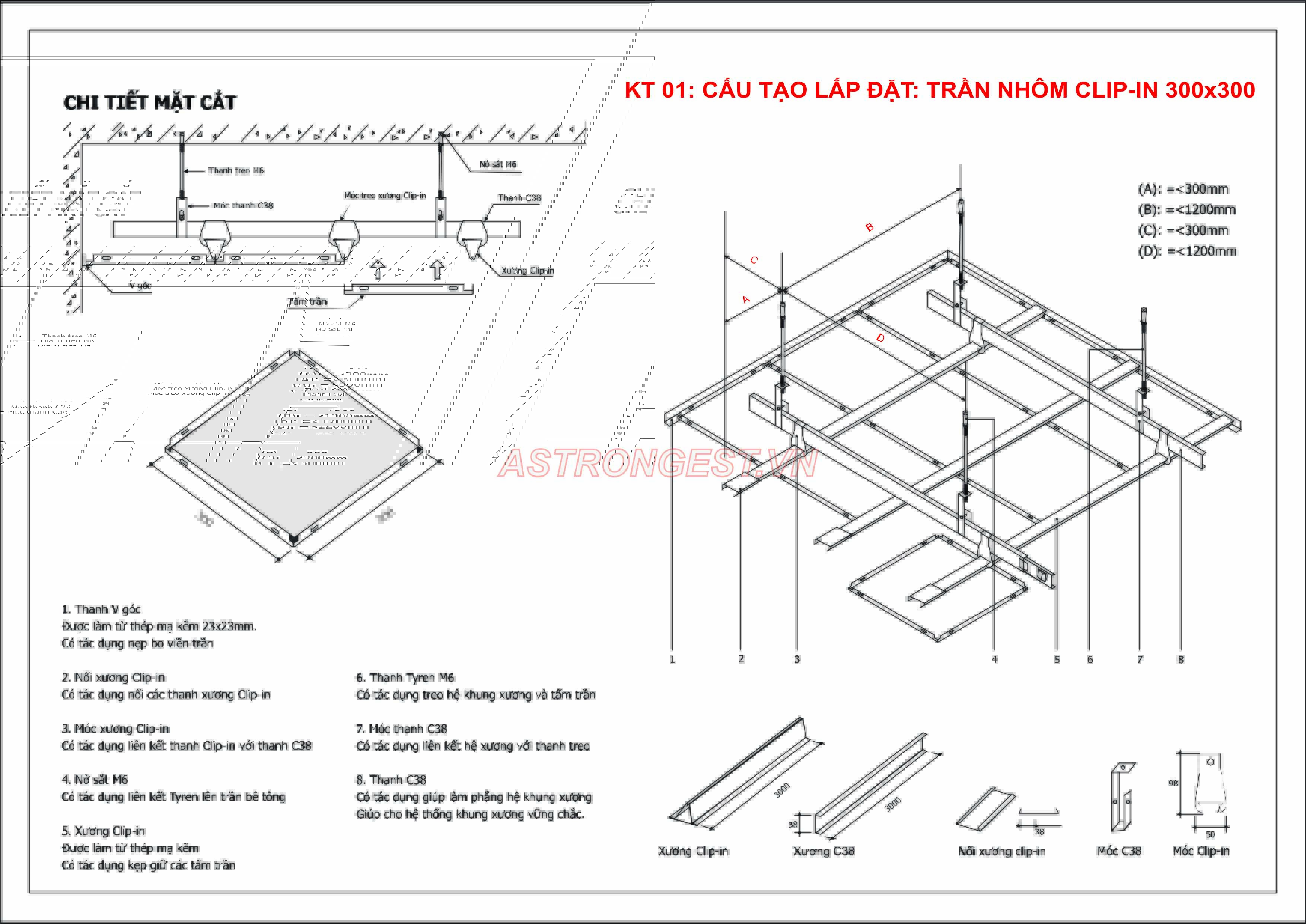 - Vật tư phụ trần nhôm bao gồm: Xương C38, Móc treo xương C38, Viền tường V nhôm 25x25, Tigen M6, Nở đạn M6, Ốc (Ecu) M6